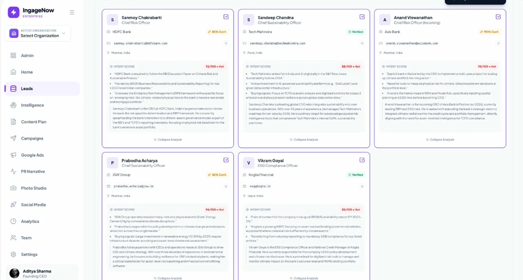 Intent scoring based on: company triggers (regulations, events, initiatives), individual signals (role, recent moves, public statements), and keyword matching. Typically 70-85% accuracy - leads scored 85+ are genuinely high-intent.