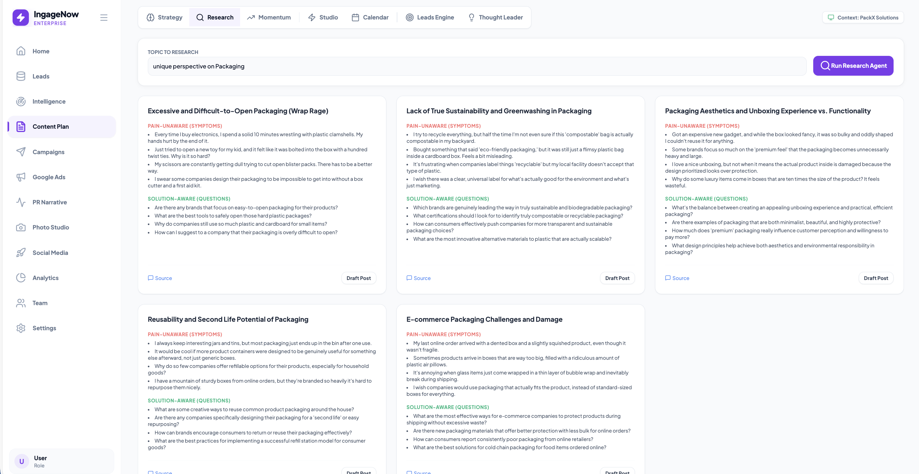 Go beyond surface-level ideas. The agent dives into Reddit, Quora, and industry forums to find 'Pain-Unaware' symptoms and 'Solution-Aware' questions.